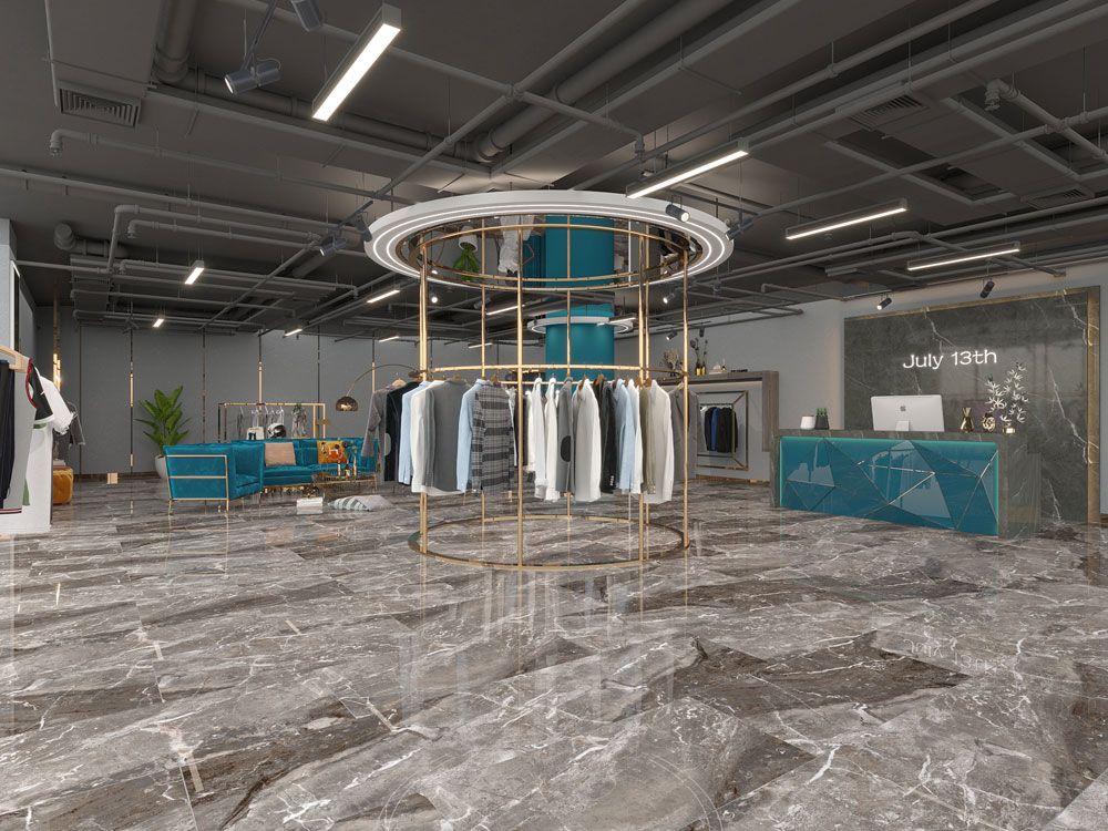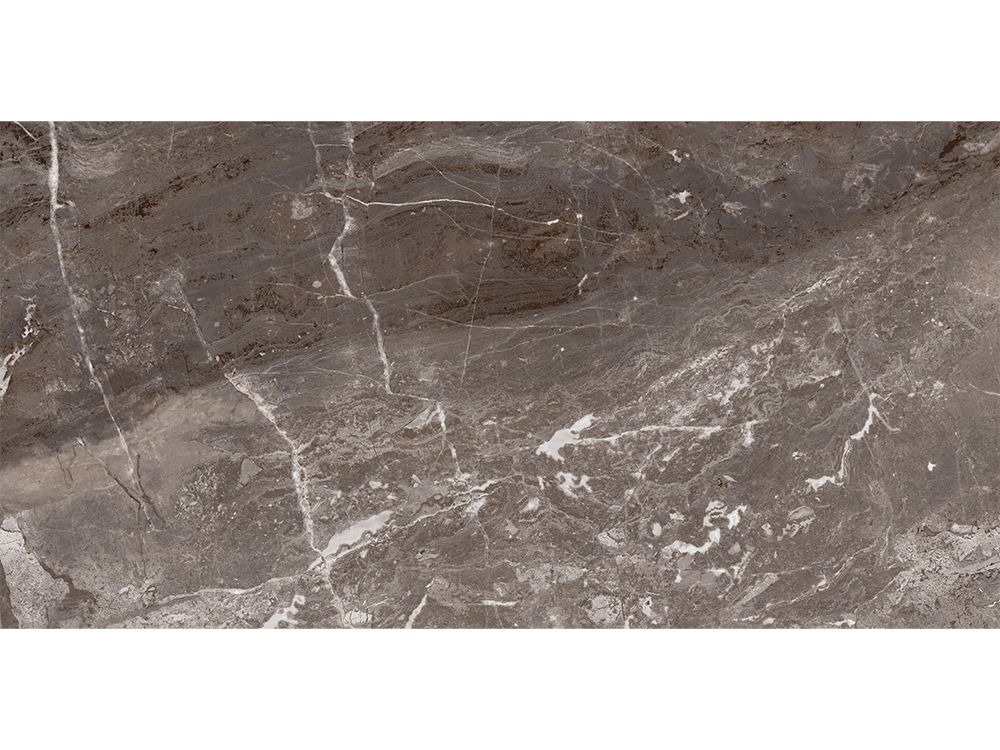 The Crown Full Lap 60×120 cm tile by QUA Granite is a rectified porcelain stoneware with a Full Lappato (glossy) finish, designed to replicate natural marble with brown, gray, and dark gray color variations. This first-quality tile is suitable for indoor floor and wall applications like living rooms and corridors