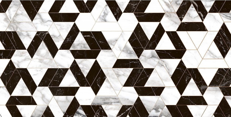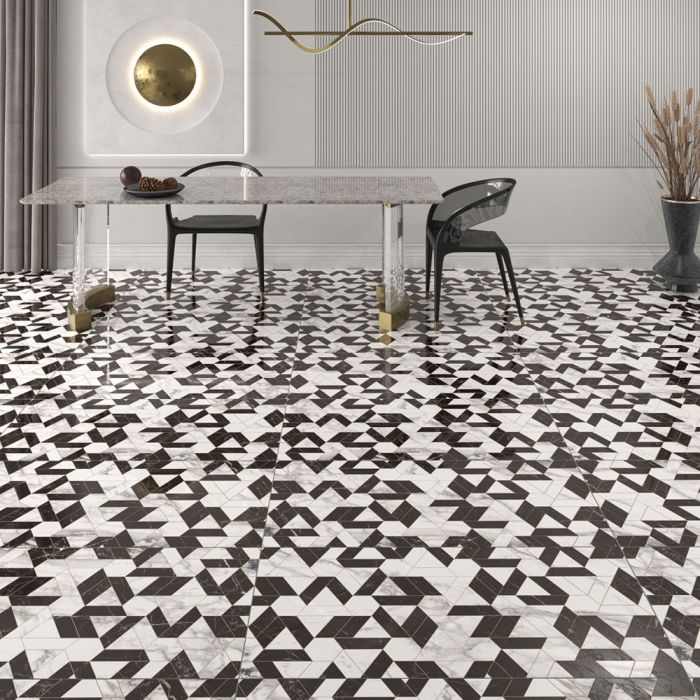 The Mosaico Nero Full Lapp 60×120 by QUA Granite is a rectified porcelain tile measuring 60×120 cm. It features a glossy (Full Lappato) finish and a mosaic design combining black and white marble in geometric shapes, suitable for both floor and wall applications.